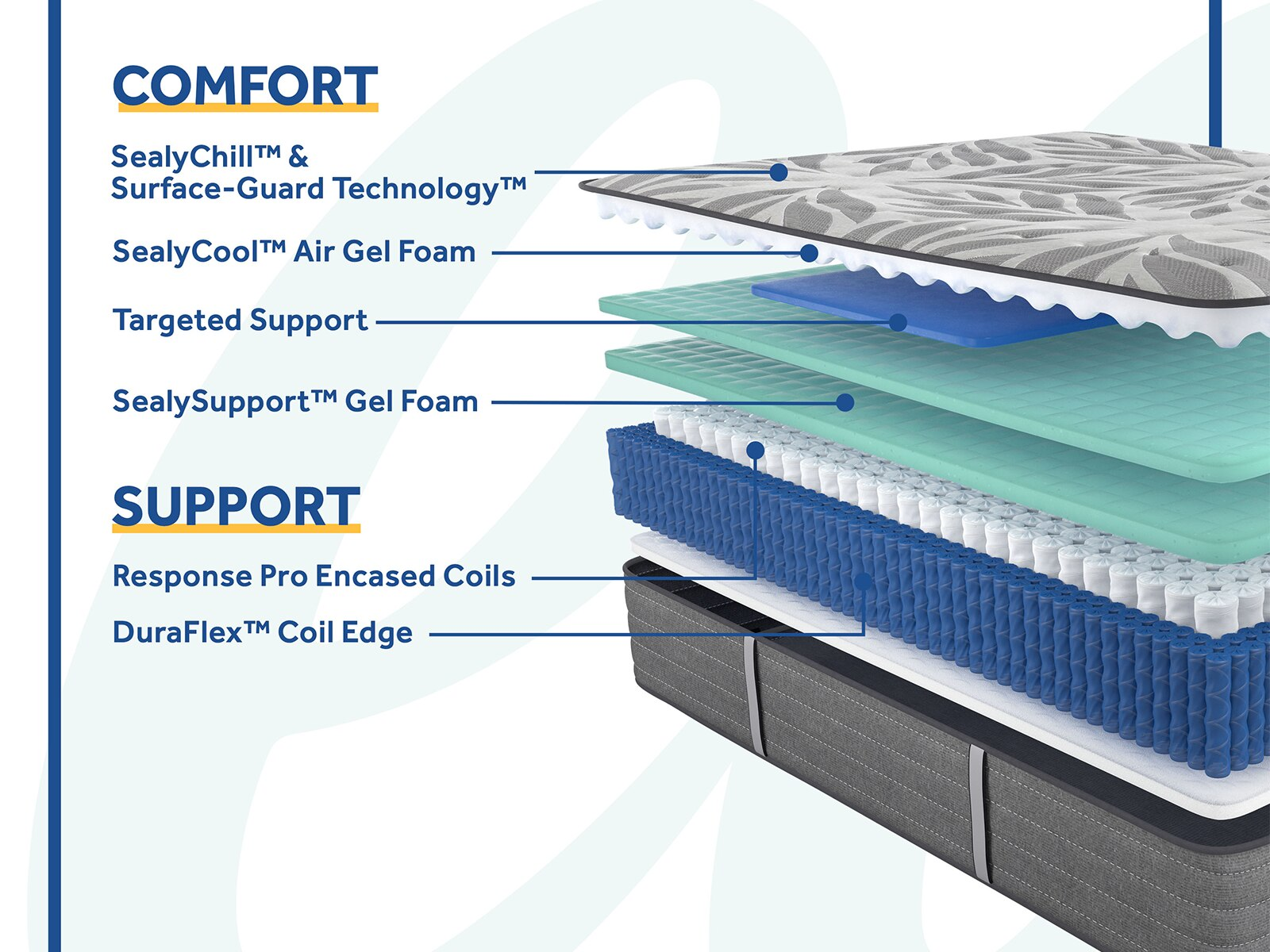 Individually wrapped Response™ Pro Encased Coils paired with high-quality traditional foams provide support and comfort for your whole body while reducing motion transfer so you’ll feel less movement from your partner throughout the night. And it’s all topped with a refreshing cool-to-touch cover and a medium feel. And it’s all backed by quality and durability that’s been tested beyond industry standards and trusted by sleepers for more than 130